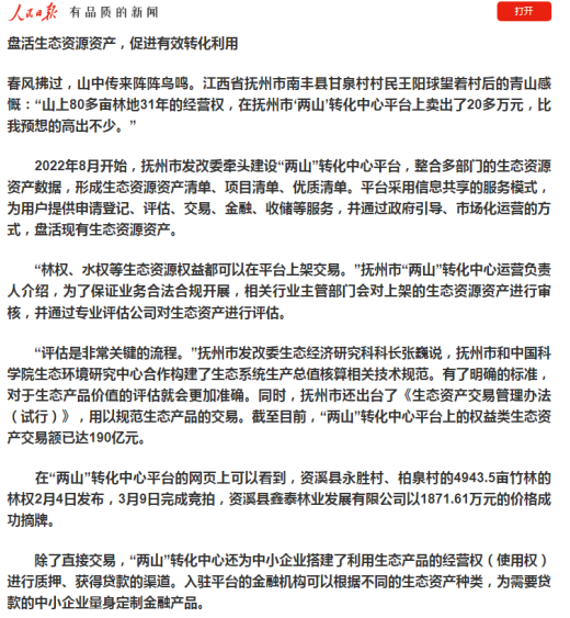 2024年3月21日,《人民日報》以“盤活生態(tài)資源資產(chǎn),促進有效轉(zhuǎn)化利用”為題,向全國推介“兩山”轉(zhuǎn)化中心平臺。